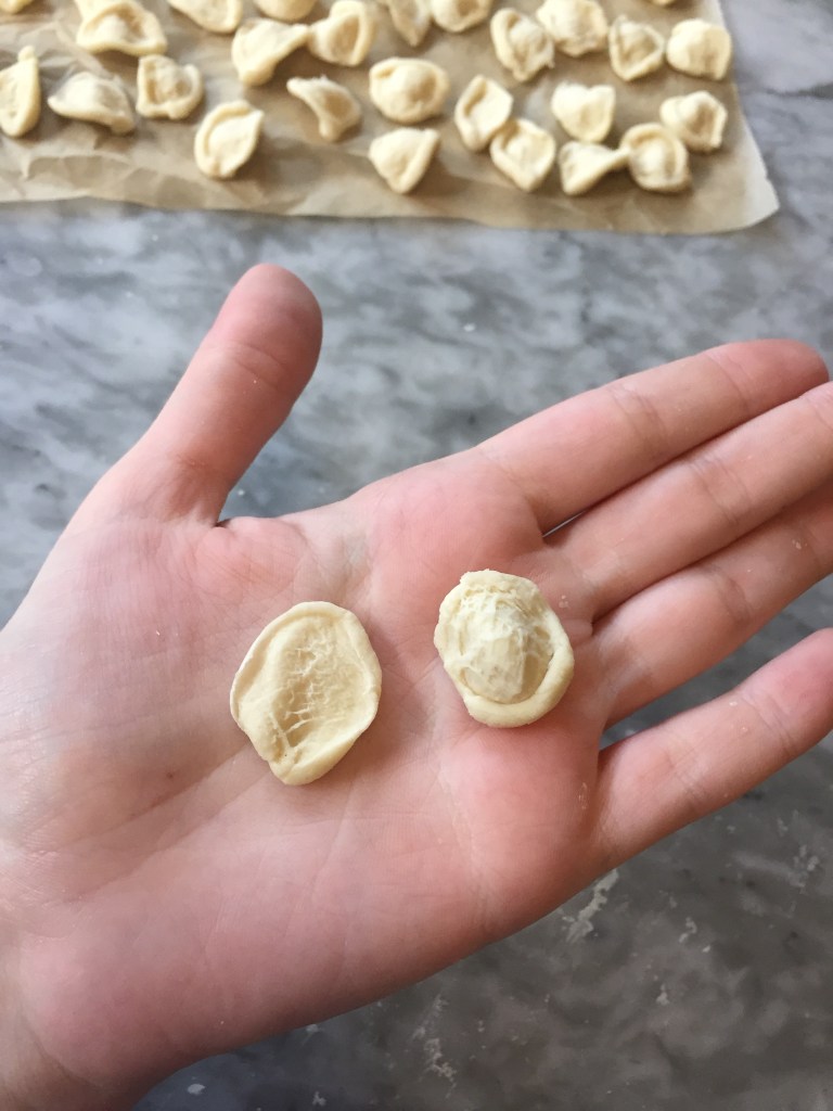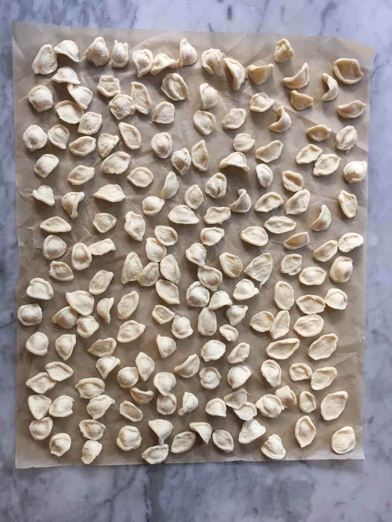 I did not have eggs, but I did have flour, so orecchiette was the obvious choice. Translating to little ears in Italian, orecchiette is made by nonas in the south that sit around, dutifully stretching out these little ears for hours. It is made with mixture of 00 flour and semolina, bound together using water instead of egg.