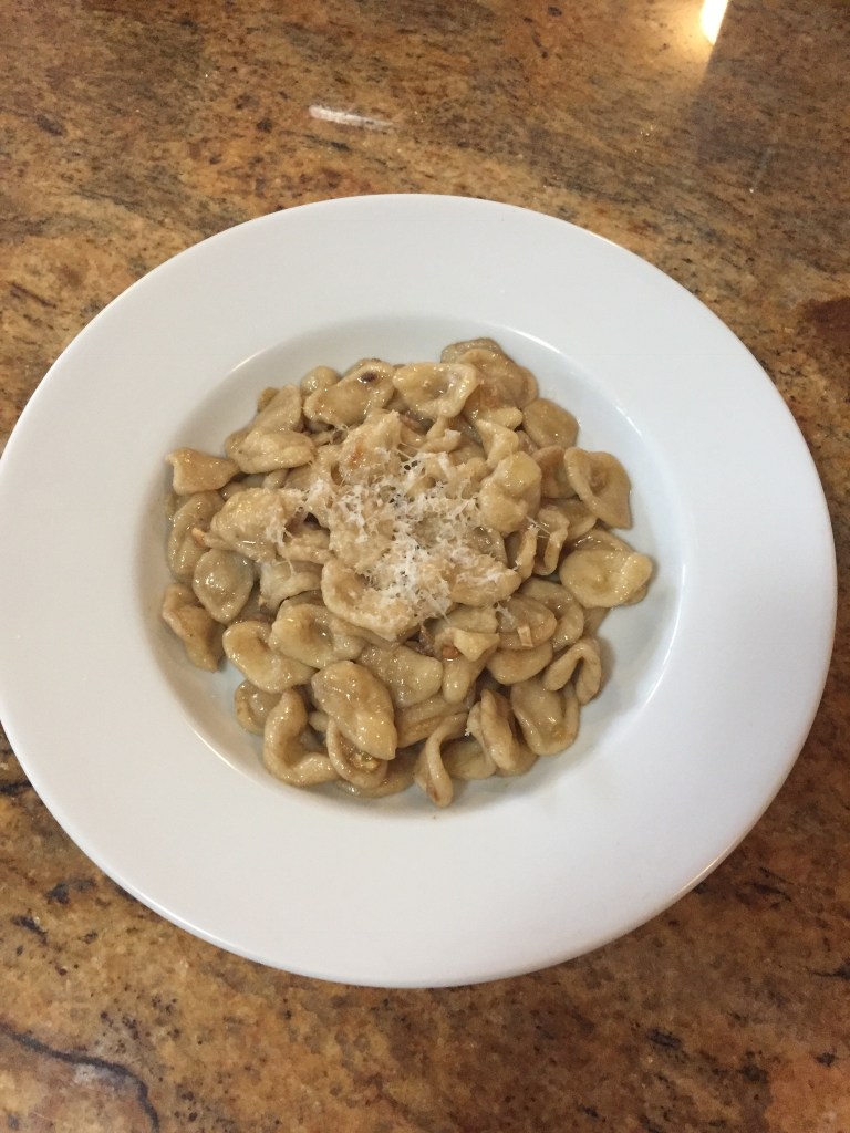 By the time I had shaped all of the dough I was famished, so I quickly boiled some water and started to compose my sauce. Over medium heat I sauteed 3 cloves of garlic in a generous amount of olive oil, then added in a whole tine of olive oil packed anchovies. Once the water boiled I added in the orecchiette until they were al dente, then transferred them to my sauce, allowing them to soak up all that infused olive oil goodness. Topped off with some Parmesan, and this dish is worthy of being served at a dinner party. If you are so inclined, some chili flakes would really round out this dish. Never let it be said that you have nothing to eat. You just have to look close enough.